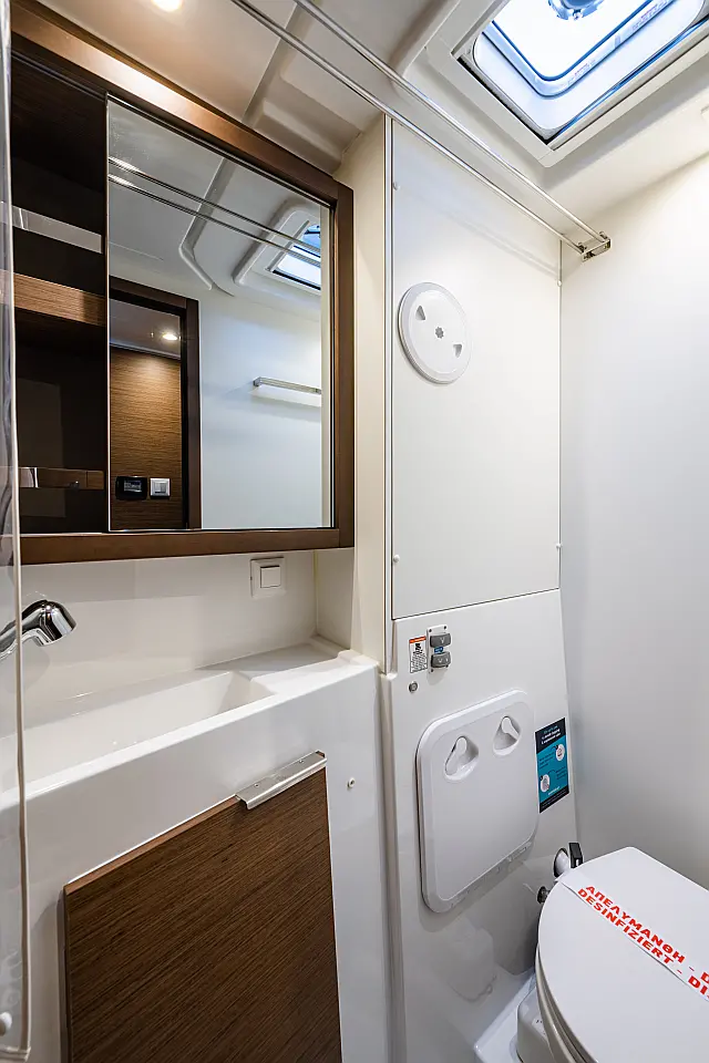 Fäkalientank , Lautsprecher im Cockpit , Elektrische Winch (Segel) , Elektrische Toilette , Cockpit-Kissen , Klimaanlage , Generator , Beiboot , Sprayhood , Badeplattform , Teak Cockpit , Bimini , Solar-Panele